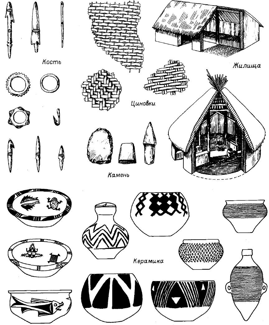 Но число последних незначительно, что заставляет предполагать использование в этой функции деревянных орудий (The neolithic village. . . , 1963, p. 310). Большинство каменных орудий принадлежит к числу шлифованных изделий и представляет собой тесла, топоры, долота, молоты и однолезвийные ножи. Имеются также и навершия булав. Как мы отмечали, отсутствие кремневых изделий просто поразительно. Отдельные наконечники стрел делались из кварцита, обработанного грубой ретушью, но предпочтение отдавалось стрелам из кости, типы которых достаточно разнообразны. Из кремня изготовлялись грубые скребки и чопперы, которые, однако, крайне редки. Специализированными производствами становятся прядение и ткачество. Отпечатки на керамике позволили установить наличие целого ряда различных видов плетеных изделий — от циновок до тканей.