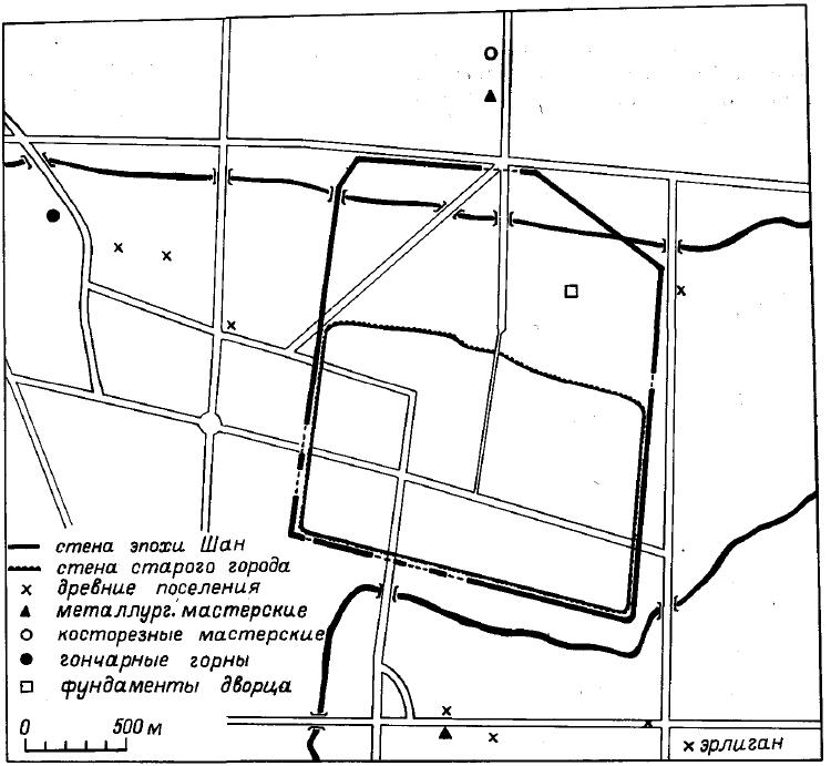 Этот последовательный прогресс налицо в следующий период, называемый то раннеиньским, то периодом Чжэнчжоу, то периодом Эрлиган. Последний термин получает в последнее время все большее практическое признание и, видимо, является наиболее удобным для специальной терминологии археологических комплексов. Ориентировочная датировка периода Эрлиган определяется в пределах 1650 —1400 гг. до н. э. В это время социологические и культурные инновации нашли концентрированное выражение в крупных центрах, которые с полным правом можно именовать городами. Как в Месопотамии и Индостане, эти городские центры стали своего рода символом и репрезентативным воплощением новой эпохи. Для периода Эрлиган таким крупнейшим центром явилось городище Чжэнчжоу — бесспорно столичный центр раннеиньского государства. Расположенный практически на территории современного крупного города, он тщательно изучается китайскими археологами в условиях, непростых для широких раскопок, и результаты проведенных работ позволяют дать довольно выразительное представление о раннегородском организме.