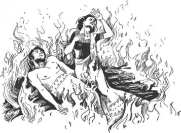 И только тогда женщина восходит на погребальный костер Но перед этим, чтобы притупить невыносимую боль, она принимает особые наркотические напитки, Когда же она возляжет рядом с телом бывшего мужа, ее ноги привязывают к тяжелым плахам, или ее предварительно оглушают И только после этого один из родственников поджигает поленья, и к небу поднимается столб пламени.