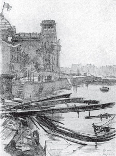 Кое-где из выбитых больших окон этого мрачного здания еще вился дымок и тянуло гарью. И никакой величественности! Над разрушенным скелетом бывшего стеклянного купола реет красный флаг — наш, советский, флаг! Но это не просто флаг, это Знамя Победы! Широченная лестница главного входа и многочисленные колонны избиты, испещрены, словно оспинами, следами осколков и пуль.