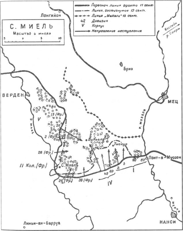 В течение четырех лет во фланг главной позиции французских армий на Западе был вбит клин глубиной в 16 миль. Это было наиболее заметной и наиболее безобразной отличительной чертой всего изломанного фронта, тянувшегося от границы Швейцарии до бельгийского побережья. Вдоль этой длинной волнистой линии фронта встречалось бесчисленное количество выступов разных размеров — но ни один из них не был так глубок и остр, как выступ, спускавшийся с высот Вевра к реке Маас у Сен-Миеля, где фронт выдавался даже за реку.