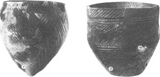 Остродонный и плоскодонный сосуды населения днепро-донецкой культуры из поселений Бузыш Черкасской области (1) и Никольского могильника в Надпорожье (2)