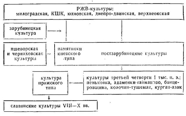 Остается определить время и место всех этих процессов. Здесь лингвистика должна уступить место археологии. 2. Археологический эквивалент Прото-балто-славянскому языковому состоянию соответствовала, скорее всего, совокупность близкородственных групп, говоривших на сходных диалектах, из которых соседние отличались наибольшим сходством, почти тождеством, а по мере удаления все более нарастали диалектные различия. Такому массиву древнего населения, состоявшему из небольших родовых коллективов, рассеянных по лесной зоне, хорошо соответствует массив археологических культур раннего железного века (РЖВ-культуры): штрихованной керамики, милоградская, юхновская, днепро-двинская, верхмеокская. Для них характерны: однородный, земледельчески-скотоводческий хозяйственный уклад; единый принцип расселения - небольшими коллективами на родовых городищах; сходные бытовые условия (во всех культурах - близкая схема жилища, с компактной жилой камерой, в милоградской и культуре штрихованной керамики - часто слегка углубленной в землю, с очажным устройством в углу; в других культурах сходная схема жилища представлена либо в наземном варианте, либо группируется в удлиненные постройки, иногда расположенные вдоль оборонительных сооружений и составляющие с ними единое целое); сходство верований, проявившееся, в частности, в погребальном обряде (ямные могилы со скудными остатками сожжений; в ряде культур могильные памятники вообще неизвестны или "археологически неуловимы"). На некоторых городищах открыты круглые в плане святилища, с оградой и идолом в центре; многочисленные загадочные мелкие поделки - "грузики дьякова типа", миниатюрные сосудики, изображения животных - все это указывает на сходную, архаичную и устойчивую структуру верований лесных племен. Таким же сходством, устойчивостью и архаичностью отличается материальная культура. Керамика представлена разнообразными вариациами высоких лепных горшков (иногда со "штриховкой" от заглаживания травой - отсюда название одной из культур - штрихованной керамики, КШК). Железные слабоизогнутые серпы, ножи "с горбатой спинкой", узколезвийные топоры, наконечники копий и двушипных дротиков, стрел и гарпунов (костяные); бронзовые булавки, подвески, бляшки, браслеты, изредка фибулы; среди украшений ранней поры встречаются скифские и гальштаттские вещи, собственные оригинальные типы бронзовых изделий - редки и отличны от своеобразной бронзы соседних, финно-угорских племен. Во II в. до н. э. в южной части ареала РЖВ-культур распространяются зарубинецкие памятники: селища с наземными и слегка углубленными постройками, сравнительно большие могильники с устойчивым обрядом (включающим обязательный набор погребального инвентаря - фибулы - и комплекс заупокойной посуды - горшок, миска, кружка новых, среднеевропейских орм). Развитие местных культур в целом, однако, не прерывается. В областях, непосредственно занятых зарубинецкой культурой (ЗБК), население покинуло древние городища, видимо, кое-где сдвинулось на новые территории; но такие же изменения со временем произошли и в областях, не занятых ЗБК, а чем дальше от Полесья и Среднего Поднепровья, тем менее и медленнее менялся уклад жизни лесных племен. Именно этот уклад отчетливо выступает в так называемых "постзарубинецких древностях", сменивших со 