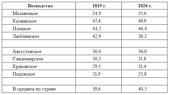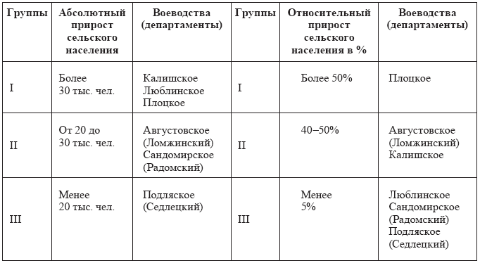 В Княжестве Варшавском наиболее населенными в сельской местности были Калишский, Люблинский, Ломжинский и Плоцкий департаменты. Причем в Плоцком, Ломжинском и Калишском департаментах доля сельского населения была наивысшей по стране. Это можно рассматривать как свидетельство достигнутого здесь наиболее высокого уровня сельскохозяйственного производства. Именно эти воеводства в Королевстве Польском продемонстрировали наивысшие показатели прироста сельского населения в 1829 г. Исключение здесь составило Люблинское воеводство, которое как по абсолютным, так и по относительным показателям оказалось на последнем месте. Следует также отметить, что Люблинское воеводство с 1819 по 1826 г. пережило абсолютное и относительное сокращение угодий прямого сельскохозяйственного назначения, а доля пашни уменьшилась на 13%, поэтому можно уверенно говорить об упадке здесь деревни и сельскохозяйственного производства. Таким образом, в целом по стране уровень развития аграрного производства был невысоким, что и сказалось на приросте сельского населения. Более благоприятные условия для развития польской деревни и аграрного производства сложились в центральных и северных воеводствах: Калишском, Августовском, Плоцком и, разумеется, в Мазовецком. Более отсталыми были южные и восточные области Королевства, особенно Люблинщина.