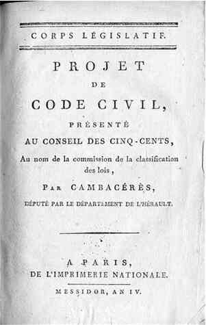 Тогда первый проект Гражданского кодекса представил Конвенту профессиональный юрист Жан-Жак-Режи де Камбасерес, который был в то время председателем комитета по законодательству. Второй проект, сокращенный до 287 статей, был представлен им же в сентябре 1794 года, третий — в июне 1796 года.