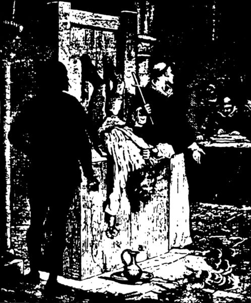 В первом случае пытаемому связывали руки за спиной веревкой, пропущенной через блок, приделанный к своду, и палачи подтягивали его как можно выше. Оставив его некоторое время в таком положении, веревку сразу отпускали так, чтобы пытаемый падал на расстояние полуаршина от полу. Это ужасное сотрясение вывихивало все суставы, а веревка, стягивавшая кисти рук, часто врезалась в тело вплоть до самых жил.