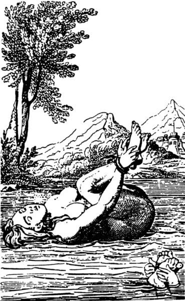 Палачи клали жертву на деревянные козлы, имевшие форму желоба, соответствовавшего по размерам человеческому телу. Брошенное тело, падая навзничь, сгибалось под действием механизма козел и принимало такое положение, что ноги оказывались много выше головы. В этом положении дыхание становилось очень затруднительным и, кроме того, пытаемый ощущал во всем теле сильные боли, причиняемые веревками, которые врезались в тело и вызывали потери крови даже без закручивания. Жертве в этом ужасном положении вводили в горло мокрую тряпку, часть которой прикрывала ноздри; затем вливали воду в рот и в нос, давая ей течь крайне медленно, так что требовался час времени для того, чтобы влить литр воды, хотя вода текла беспрерывно. Таким образом пытаемый не имел промежутка времени, чтобы вздохнуть; он ежеминутно делал усилия глотать, надеясь набрать хоть немного воздуха, но так как мокрая тряпка мешала этому, а вода в тоже время шла и через ноздри, то, понятно, что все это устройство затрудняло самое необходимое для жизни отправление, т. е. — дыхание. А потому, когда пытка кончалась, то часто из горла вынимали тряпку, всю пропитанную кровью из сосудов, лопнувших от напряжения несчастного. К этому надо прибавить, что при помощи крута постоянно натягивались связывавшие руки и ноги веревки и врезались в тело до костей.