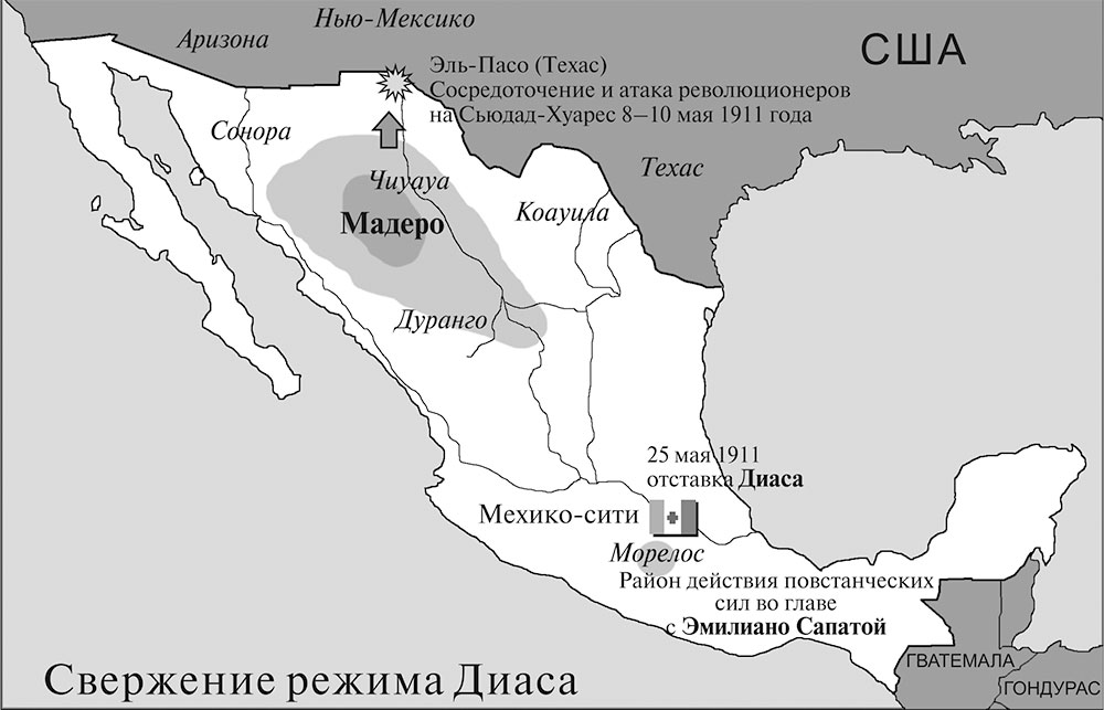 В декабре 1910-го – январе 1911 года Террасас сообщал Диасу о переломе психологической ситуации в пользу правительства. О капитуляции, по его словам, подумывал даже Ороско, что было вымыслом чистой воды. Однако партизан на самом деле выбили из всех крупных населенных пунктов, что очень сильно подорвало международный престиж Мадеро. Вождь революции пытался всеми силами добиться от американской администрации статуса воюющей стороны, чтобы иметь право беспрепятственно закупать в Америке оружие и боеприпасы. Но в Вашингтоне считали крах революции делом решенным: ведь повстанцам так и не удалось овладеть ни одним городом Мексики. Мало того, все их успехи ограничивались только внезапными набегами на городки и поселки с небольшими гарнизонами. Во всех открытых столкновениях с правительственной армией повстанцы неизменно терпели поражение.[145]