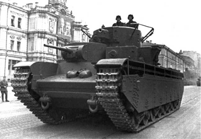 Тяжелый танк Т-35 проходит по Крещатику во время военного парада. Киев, 7 ноября 1938 года. Эти машины были единственными в мире серийными пятибашенными танками, но к середине 1937 года стало ясно, что их броневая защита не отвечает современным требованиям. Работы по созданию новой тяжелой многобашенной машины в конечном итоге привели к появлению КВ-1 (АСКМ).