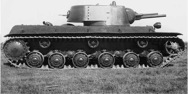 Опытный образец танка КВ (машина № У-0), вид справа. Сентябрь 1939 года. Хорошо видны гужоны, с помощью которых задняя гнутая часть башни соединялась с бортами. Обратите внимание, что первоначально борт корпуса в кормовой части был ниже, но впоследствии его увеличили, приварив дополнительный кусок бронелиста (АСКМ).