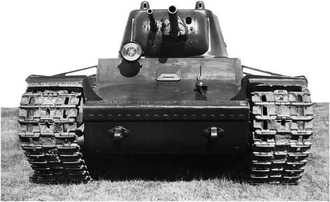 Опытный образец танка КВ (машина № У-0), вид сзади. Сентябрь 1939 года. Обратите внимание на форму выхлопных патрубков на крыше корпуса — впоследствии их конструкцию изменили. Хорошо видно высокое качество изготовления корпуса танка: кромки бронелистов обработаны строжкой, сварные швы зачищены (АСКМ).