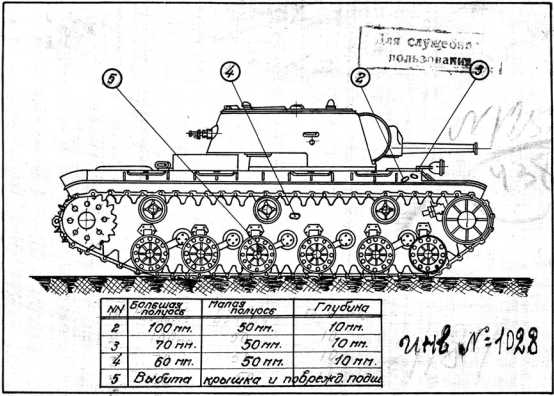Схема с изображением мест попаданий в танк КВ-1 снарядов во время действий машины на Карельском перешейке в декабре 1939 года, копия заводских калек. В борт машины попало четыре снаряда (АСКМ).