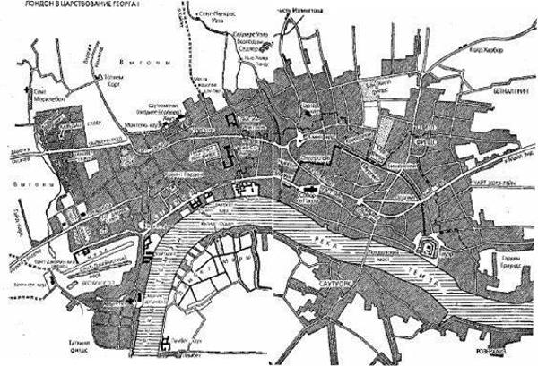 В еврейском квартале и особенно на Бейзингхолл-стрит были расположены дома некоторых из богатейших людей Англии. Но вельможи уже покидали свои родовые дворцы, находившиеся в многолюдном Сити и на Стрэнде, где быстро исчезали сады. В течение лондонского сезона знать жила около Ковент-гардена, Пикадилли, Блумсбери, Сент-Джеймс-сквера или в некоторых районах Вестминстера. Сельские джентльмены, различные чиновники, члены парламента и лица свободных профессий имели меньшие дома, расположенные вокруг особняков знати в тех же самых районах. Таково происхождение многих знаменитых лондонских «скверов» (кварталов).