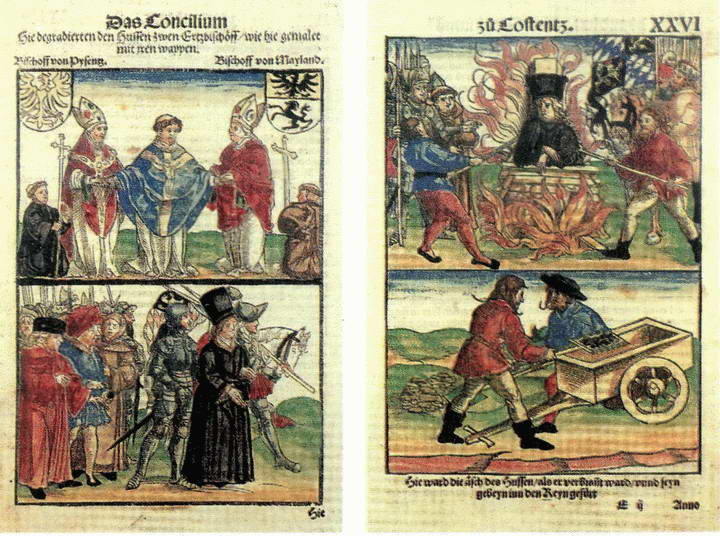 Богемский реформатор Ян Гус (около 1370–1415) приехал в Констанц, чтобы отстоять свое учение. Несмотря на то что король Сигизмунд обещал ему свободный проезд, он был арестован, обвинен в ереси и сожжен. Хроника запечатлела, как два архиепископа лишают Гуса духовного сана, затем облаченного в черную одежду еретика проводят через город, сжигают на костре в присутствии герцога Людвига Баварского и бросают его пепел в Рейн.