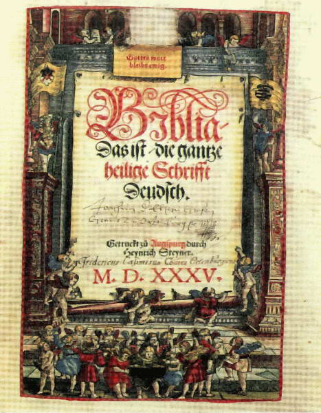На протяжении Средних веков имело хождение не менее 4 тыс. рукописных Библий на немецком языке, из них 43 — с полным текстом, но ни одна из них не получила всеобщего признания. Перевод Библии, выполненный Мартином Лютером, оказался успешен не только благодаря образному языку, который он «выхватил» из уст народа, а также из-за точности в критике текста, к которой стремился Лютер — университетский ученый-гуманист. Лютер закончил перевод в 1534 г., и уже год спустя в Аугсбурге появилась Библия, предназначенная для князей, покровителей и знати. Это было роскошное издание с большими гравюрами на дереве таких мастеров, как Гольбейн и Кранах. Первый обладатель изображенного экземпляра, граф Казимир фон Ортенбург, будучи строгим кальвинистом, сделал лик Божий на титульном листе неузнаваемым.