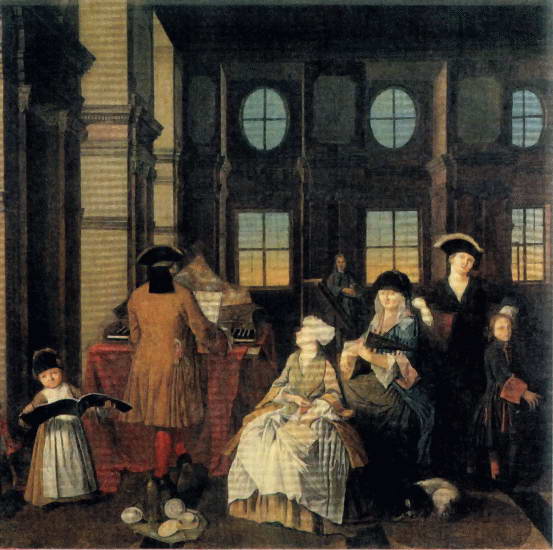 Германия, середина XVIII в. Перерыв, во время которого семья пила кофе, закончился, родители уже играют прелюдию на спинете и лютне, а дети ждут, когда им надо будет начинать петь. Домашнее музицирование было чем-то большим, нежели просто семейное развлечение. Оно представляло собой культурную привилегию бюргерства, которое таким образом делало себя независимым от придворных опер и концертов и с присущим ему стилем обрело собственные формы выражения.