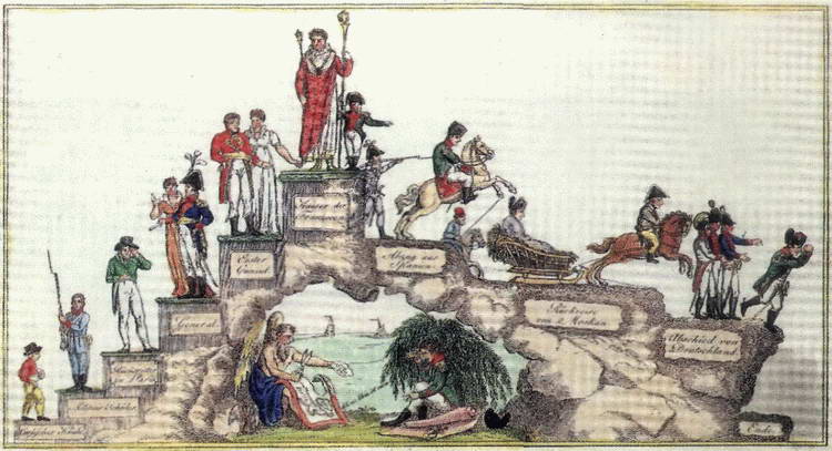 Карикатура на Наполеона после его свержения: «корсиканский юнец» поднимается со ступени на ступень к своему успеху, и вот он на самом верху рядом с Жозефиной в качестве первого консула и императора французов. Затем начинается путь вниз: ему пришлось убраться из Испании, из Москвы, а потом из Германии; государи Австрии, Пруссии и России сталкивают его по лестнице успеха, В итоге он сидит перед Хроносом, который вырезает для него из карты остров Эльба, и вздыхает: «Ах, как мало мое владение».