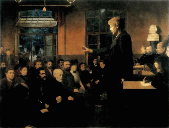 Агитационное собрание социал-демократов в конце 90-х годов XIX в. В углу сияет бюст социалистического пророка Карла Маркса. В непосредственной близости от него расположились полицейские чиновники, которые при малейшем незаконном высказывании распустят собрание. Перед публикой, прислушивающейся в напряженном внимании, стоит оратор, возглашающий слово. Его голова полностью соответствует традиции иконографии Христа, а правая рука поднята, точно благословляя. Благая весть социализма доходила в основном до протестантских промышленных рабочих; в 1871 г. на выборах в рейхстаг 3,2% избирателей отдали свои голоса социал-демократии, а в 1912 г. их было уже 34,8%.