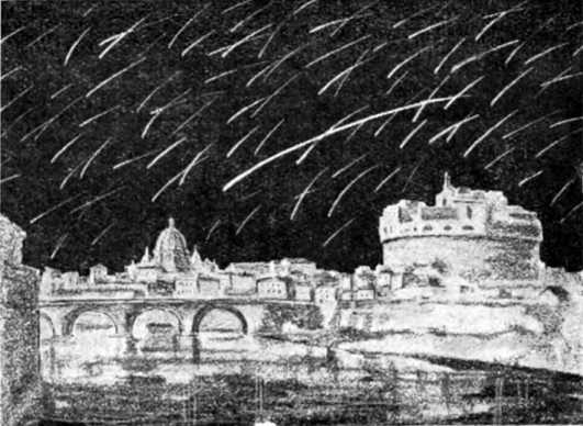 Поздно ночью, возвращаясь к себе домой, некоторые из этих телеграфистов, жившие в Европе, были поражены необыкновенным небесным явлением. По черному звездному небу пролетали во всех направлениях сотни ярких и слабых «падающих» звезд. Это был настоящий звездный дождь! Метеоров падало так много, что сосчитать их не было никакой возможности. Ни один из телеграфистов и не подозревал, что загадочная телеграмма, переданная сегодня, имеет самое близкое отношение к звездному дождю.