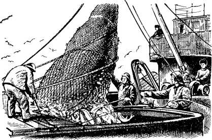 Работа идет под оглушительный концерт разъяренных волн. Обжигает пронизывающий до костей ветер. Но это не смущает рыбаков. Рыба, как на конвейере, передается раздельщиками из рук в руки. Первый раздельщик ловким движением ножа обезглавливает рыбу. Второй — вспарывает брюхо. Третий — осторожно вынимает из брюха розовато-белую печень и укладывает ее в бидон. Четвертый — бросает разделанную рыбину на наклонный желоб, идущий в трюм. В трюме рыбу засаливают, а потом охлаждают, пересыпая уложенную навалом треску мелко раздробленным льдом.