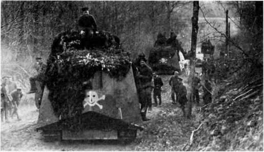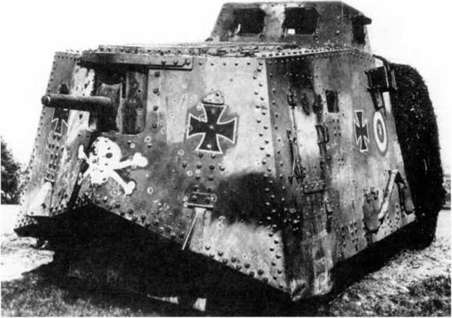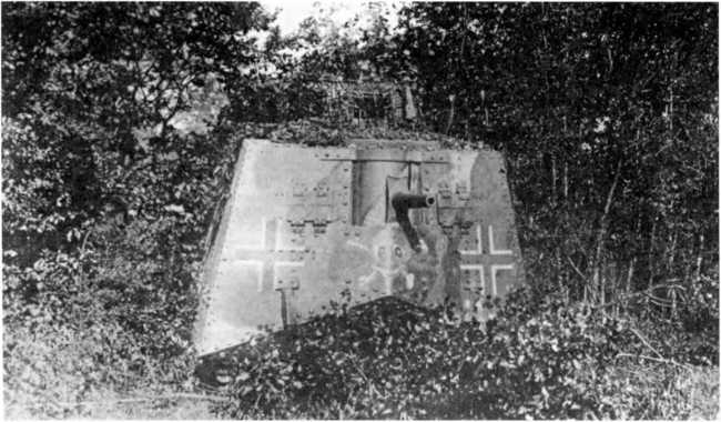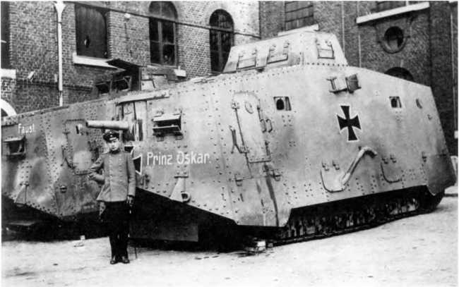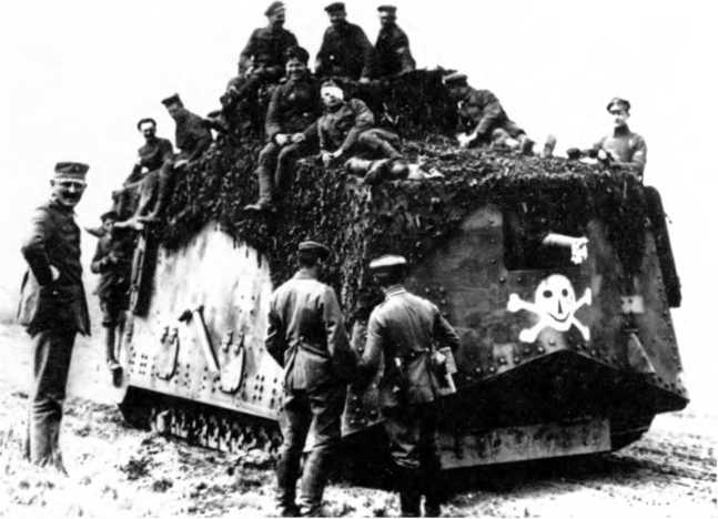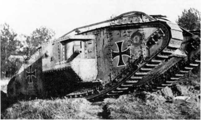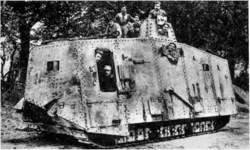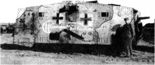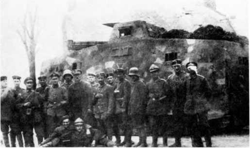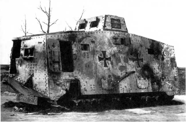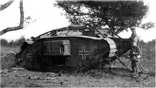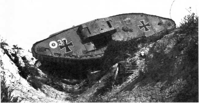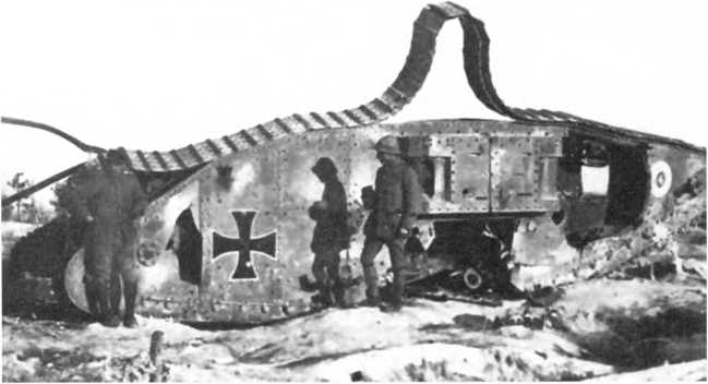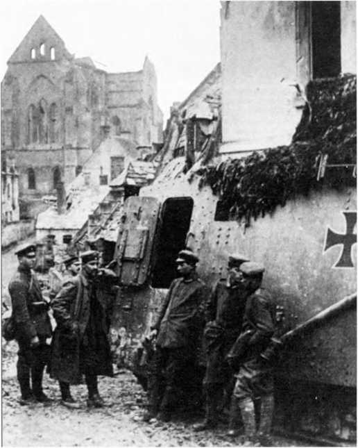 В МАРТОВСКОМ НАСТУПЛЕНИИ. Во время большого наступления в Пиккардии (операция «Михаэль», 21 марта — 4 апреля 1918 г.) германцы на фронте атаки шириной 70 км между Аррасом и Ля-Фером ввели в дело 3 армии в составе 62 дивизии — около 450 тыс. штыков при 6800 орудиях, 1000 самолетах и всего 19 танках (из них 10 — собственного производства и 9 — трофейных). Германцы куда больше полагались на тщательно подготовленный и четко управляемый огонь артиллерии разных калибров и уровней и новые боевые приемы пехоты — включая действия штурмовых групп, оснащенных легким автоматическим оружием, гранатами и минометами и обученных тактике просачивания — нежели на бронированные машины. Хотя германская армия уже вполне испытала на себе действие таких машин. Впервые германские танковые части вступили в бой в первый день наступления, 21 марта, в полосе наступления 18-й германской армии против британских войск, и произошло это всего в 50–52 километрах от того места, где в 1916-м вышли в первый бой британские танки — в условиях позиционной войны на Западе линия фронта смешалась не так уж значительно. 18-я армия в 24 пехотные дивизии при более чем 3000 орудиях действовала на фронте шириной 33 км. Понятно, что танковая атака составляла лишь очень малую часть ее наступления.