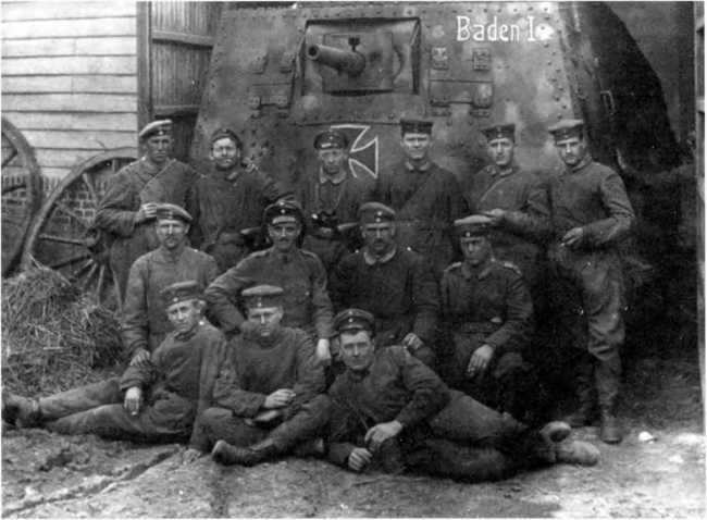 Танк A7V № 505 «Баден-I» и его экипаж из состава 3-го «штурмового отделения». Танк еще несет раннюю камуфляжную окраску, но уже с «железными крестами» и именем машины. Вспомогательная мушка со ствола орудия снята. Танкисты — в повседневной форме.