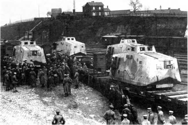В Монсё-сюр-Самбр (Шарлеруа) прибыли с завода четыре A7V с корпусами «Крупп» и «Рёхлинг». Конец марта 1918 г. Обратим внимание на полное бронирование ходовой части, тумбовые орудийные установки и удлиненные выхлопные трубы танков.