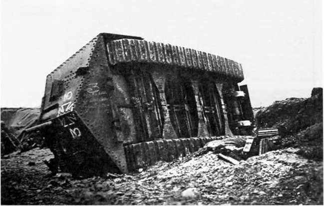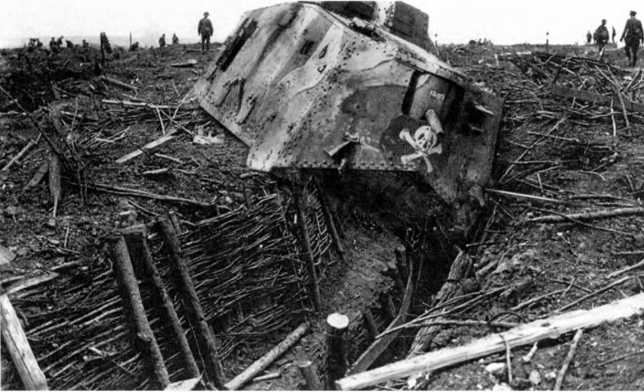 Танк A7V № 542 «Эльфриде», опрокинувшийся при переходе через воронку у Виллер-Бретонне. Хорошо видны незащищенное днище танка, выступающие картеры бортовых передач.