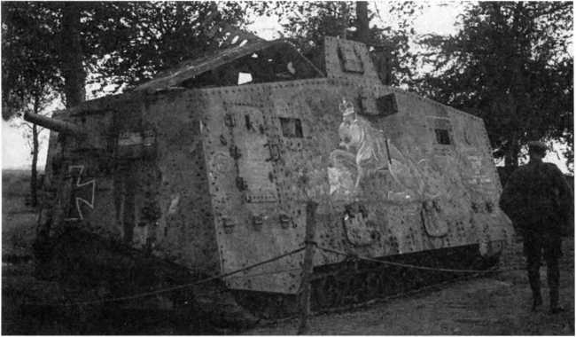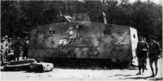 Германский танк № 506 «Мефисто», ставший трофеем австралийской пехотой. На борту корпуса уже нарисован британский «имперский» лев, наложивший лапу на A7V, и обозначена дата, когда он был выведен из строя.