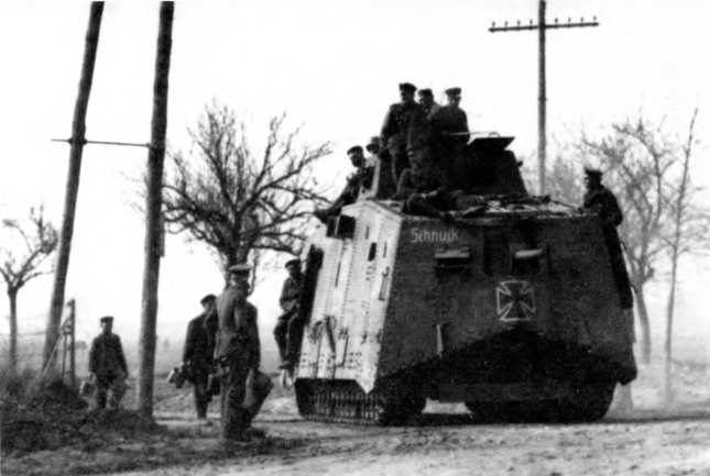 Танк A7V № 504 „Шнук“ 2-го „штурмового отделения“ на марше, начало мая 1918 г. Пулеметы убраны внутрь машины.
