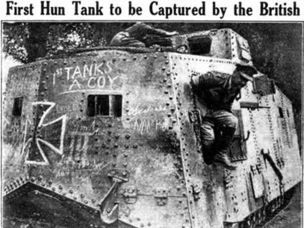 Фотография танка A7V «Эльфриде» в британской прессе и радостное сообщение — «Первый танк гуннов, взятый британцами» (пресса союзников любила тогда именовать «гуннами» германцев).