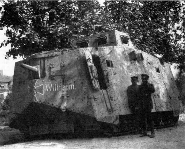 Танк A7V № 503 с именем «Вильгельм» из 3-го «штурмового отделения», конец июня 1918 г. Пулеметы убраны, верхняя рубка — без дополнительной бронезащиты. Обратим внимание на открытые смотровые лючки, запоры двери корпуса и съемную ступеньку под дверью.