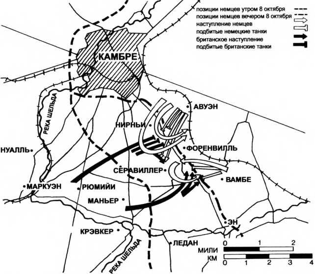 Уже утром 8 октября около деревни Нирньи британские танки Mk IV (по другим данным, более новые танки Mk V) рот А и С батальона L (12-го батальона британского Танкового корпуса) встретились с германским танковым отделением, оснащенным трофейными Mk IV в составе I пушечною «самца» и 3 пулеметных «самок». Предрассветные сумерки и однотипность машин поначалу сыграли на руку германским танкистам. Британский танк L16 роты А под командованием капитана Ро принял германские танки за танки действующей у соседней деревни Серенвиль роты С того же батальона L и понял свою ошибку, только приблизившись на дальность 50 м. Прежде чем L16 успел выстрелить, он получил два прямых попадания, командир был ранен, водитель убит. Капитан Рос остальными членами экипажа покинул танк и перебрался в танк L19. В этом танке уже были убиты пять человек экипажа, включая наводчиков орудий, поэтому огонь из орудий он не вел. Командир танка L19 лейтенант Уорсеп обстреливал германские танки из пулемета, но вскоре танк получил прямое попадание снаряда, в нем возник пожар. Покидая танк вместе с уцелевшими танкистами, лейтенант подорвал его. Танк L12 той же роты также поздно заметил противника и поначалу принял его танки за танки роты С. В результате и этот танк был выведен из строя двумя попаданиями снарядов. Попадание германского снаряда получил и танк L8, у него оказался пробит радиатор, и машина неподвижно остановилась. Командир танка лейтенант Мартель приказал экипажу покинуть танк и принять участие в бою пешим порядком. Вместе с артиллерийским наблюдателем он развернул оставленную здесь германцами полевую пушку, расстрелял из нее свой танк, чтобы не дать его захватить, после чего вывел из строя два германских Mk IV. Танк L54 роты С под командой лейтенанта Уолтерса, столкнувшись с германскими пулеметными Mk IV, обстрелял их из пулеметов, принудив отойти. Еще два германских пулеметных танка были подбиты пушечными британскими танками, командирами которых были лейтенанты Кларк и Шерат.