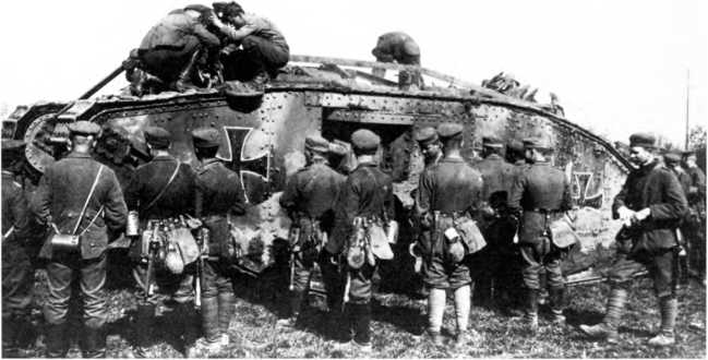 Дважды трофейный. Поврежденный в бою танк Mk IV «самка» из состава германского танкового «штурмового отделения» взят британскими солдатами. Танк несет прямые кресты.